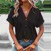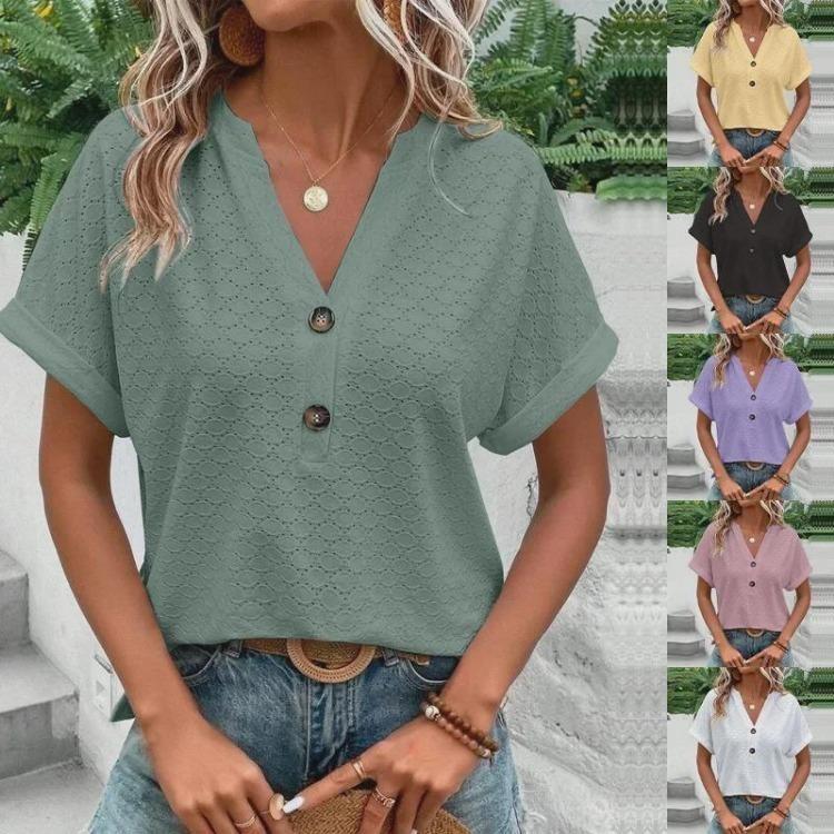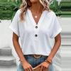 Embrace effortless style with this solid color V-neck casual T-shirt for women, perfect for the 2023 Spring/Summer season. Crafted from high-quality acrylic, this T-shirt offers a soft and comfortable feel ideal for everyday wear. The short sleeves keep it cool and breezy, while the button detailing adds a touch of elegance. Perfect for pairing with your favorite jeans or shorts, this versatile top effortlessly completes any casual look. Ideal for those who appreciate simplicity with a dash of sophistication.
