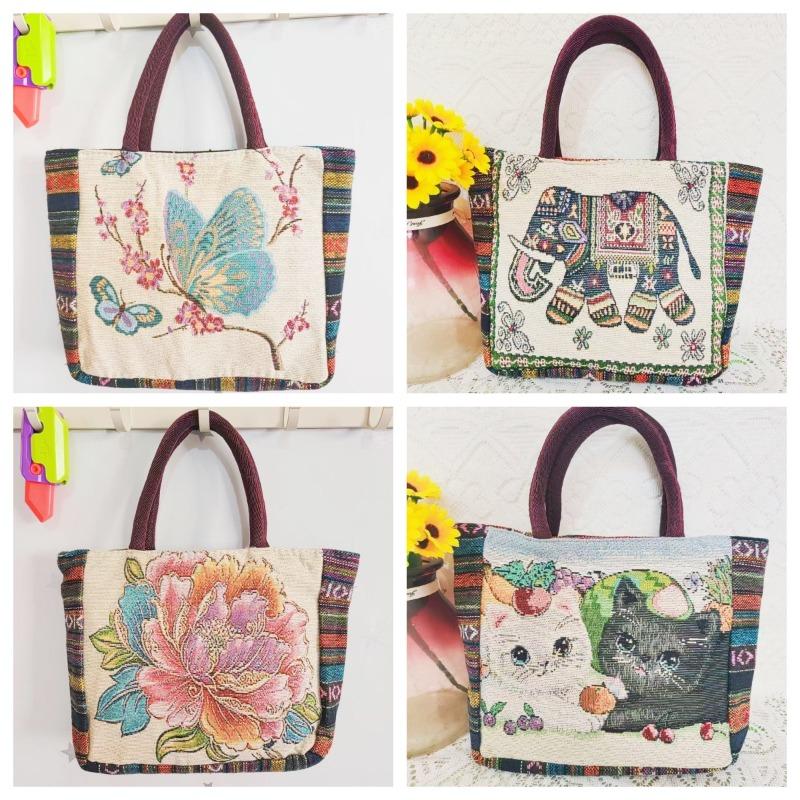 Canvas bag, women's large-capacity double-sided embroidered animal handbag, mommy bag, go shopping, handbag