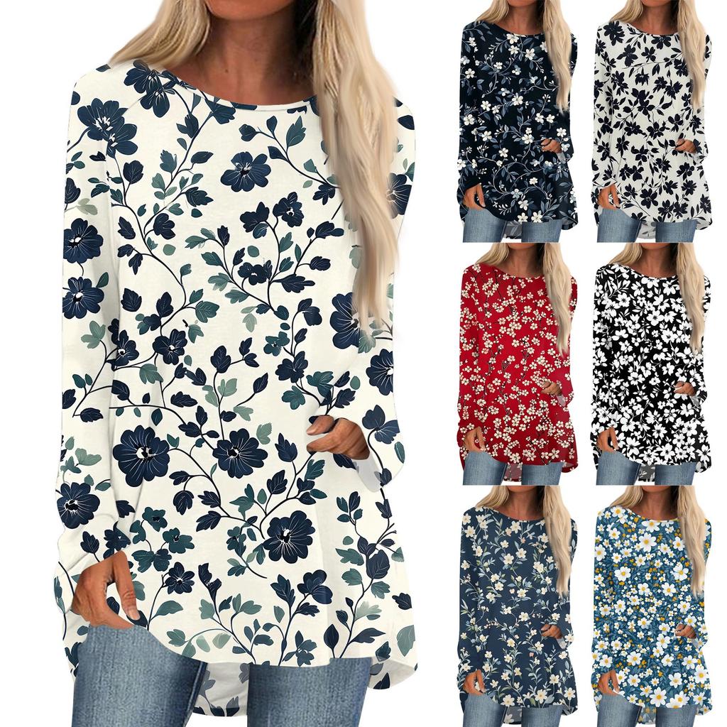 Women's Fashion Casual Long Sleeve Print Round Neck Pullover Top Blouse