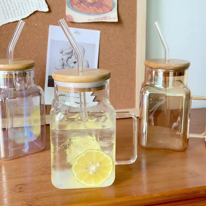 Floral Glass Straw Cup with Square Lid & Handle - High Borosilicate Transparent Design