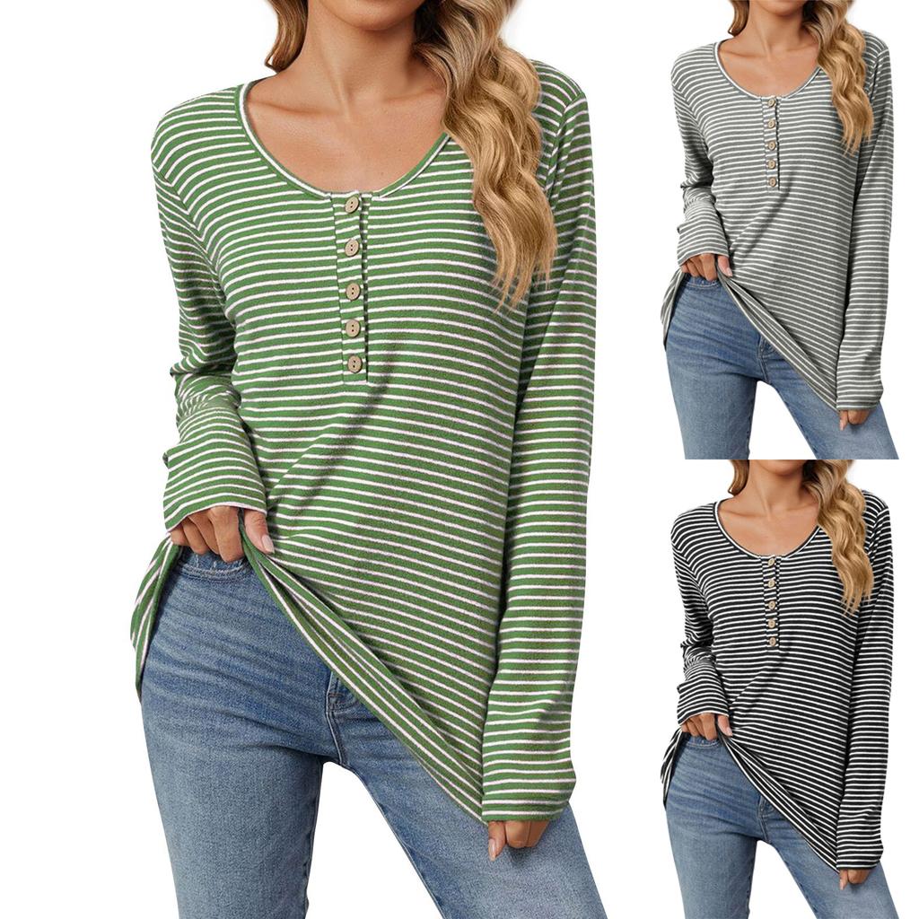 Women's Fashion Striped Loose Fit Casual Long Sleeve Button-Up T-Shirt Top