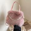 Winter Soft Faux Fur Shoulder Bags for Women Simple Pearl Chain Ladies Plush Crossbody Bags Solid Color Female Handbags Purse