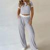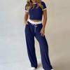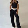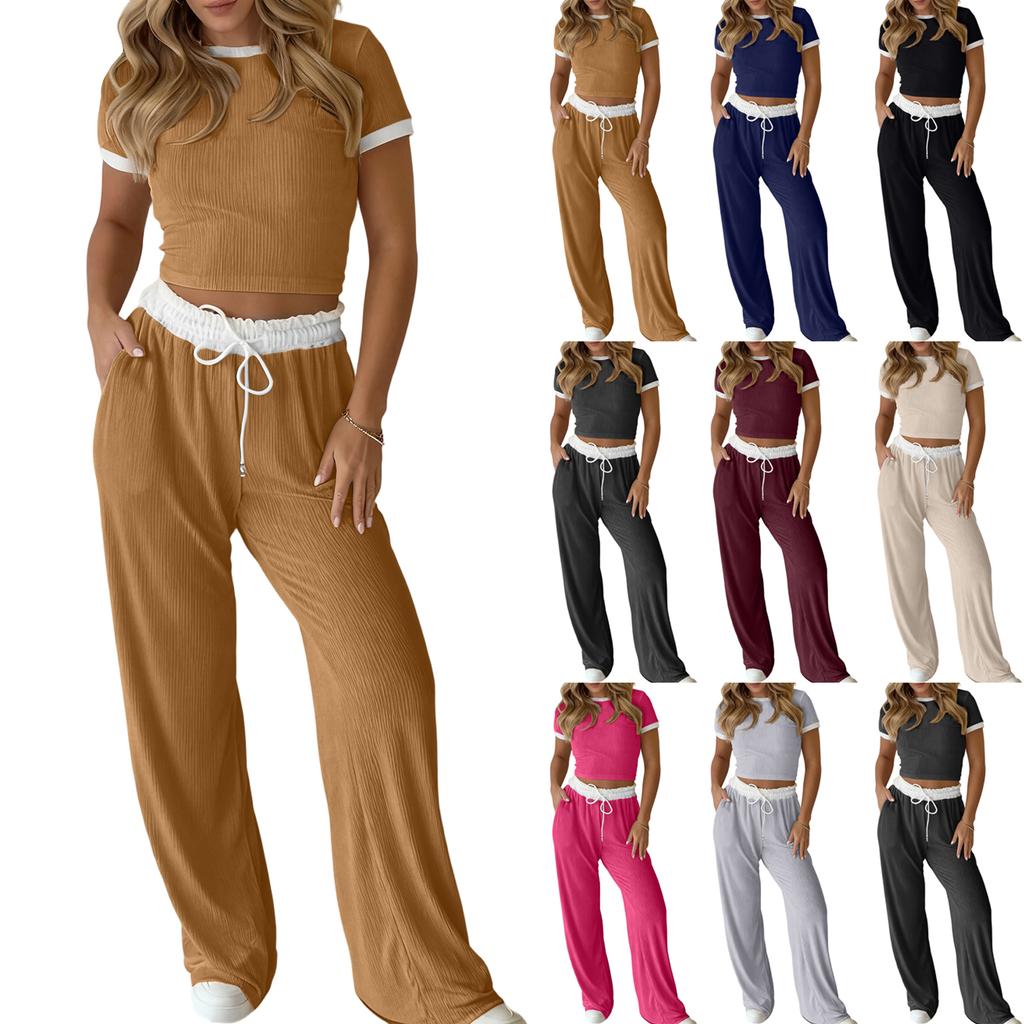 Women's Fashion Color Blocked Summer Round Neck Short Sleeved Top With Elastic Waist Casual Pants Sportswear Two-piece Set