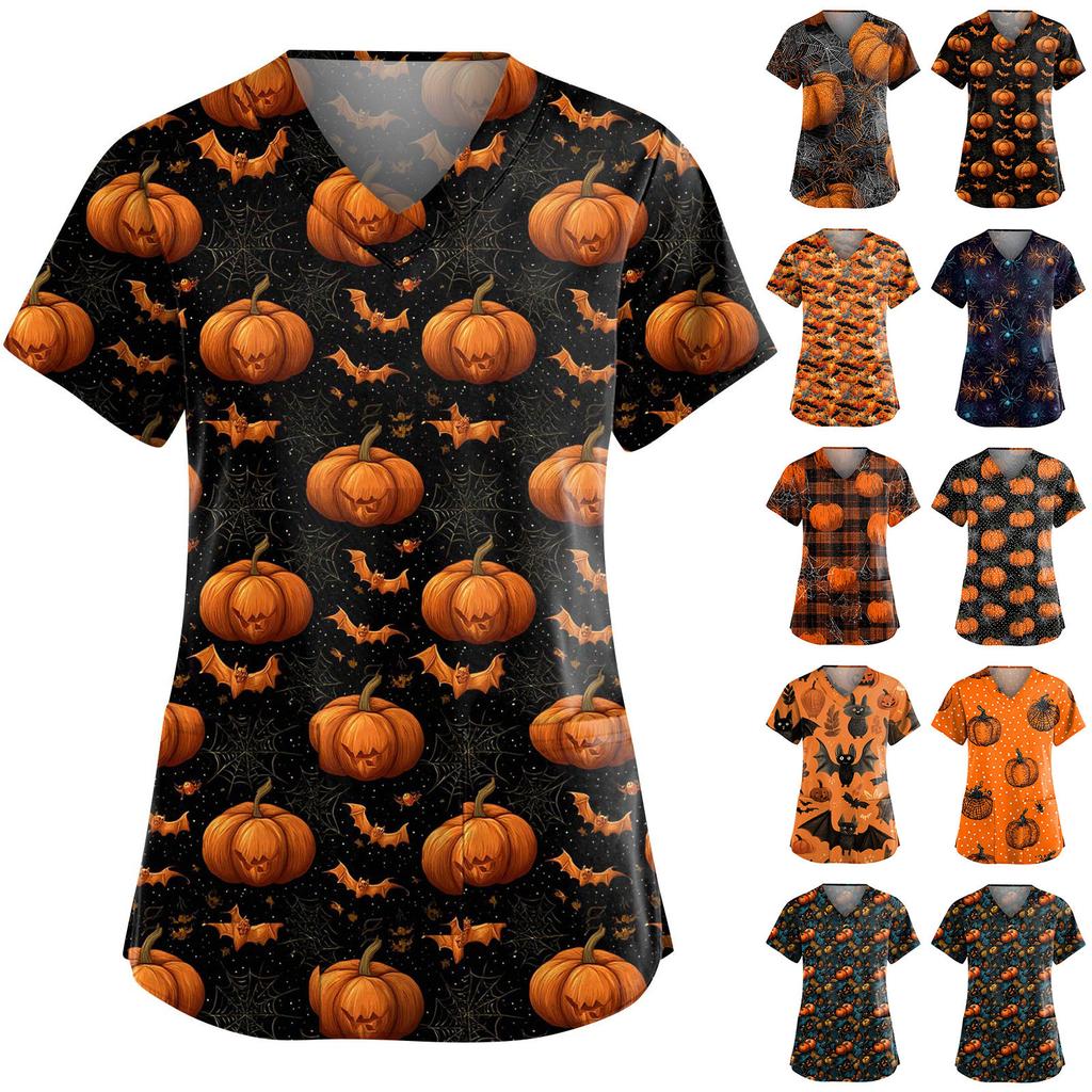 Dámská móda Overaly s krátkým rukávem a výstřihem do V s kapsami Halloweenské potištěné topy Oblečení