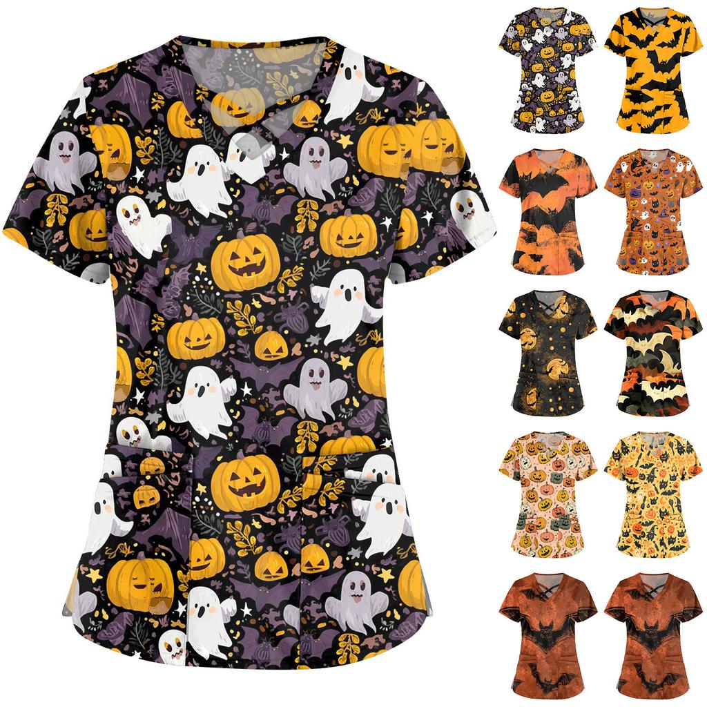 Dámská móda Overaly s výstřihem do V a krátkým rukávem Top s potiskem Halloweenu Oblečení