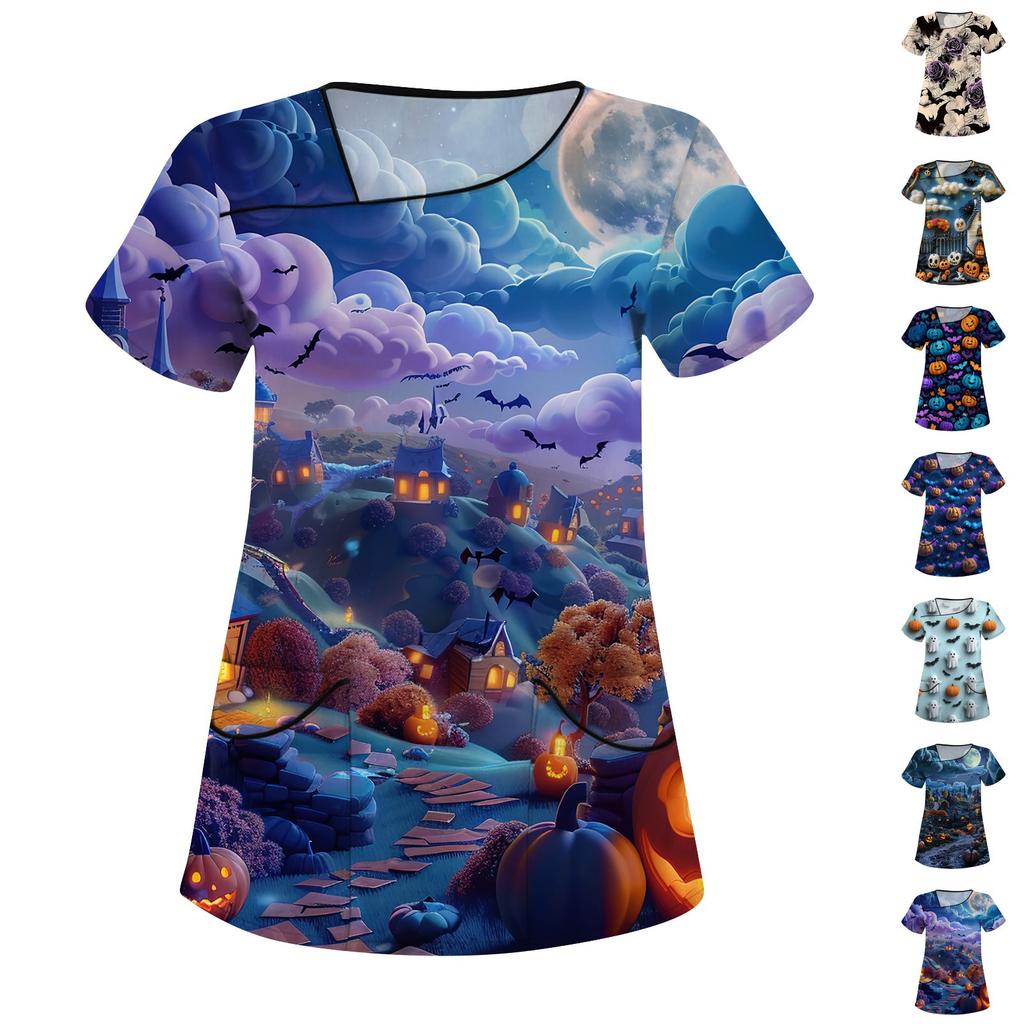 Dámské potištěné pracovní oblečení, šikmý límec a dvojité kapsy, základní top pulovr