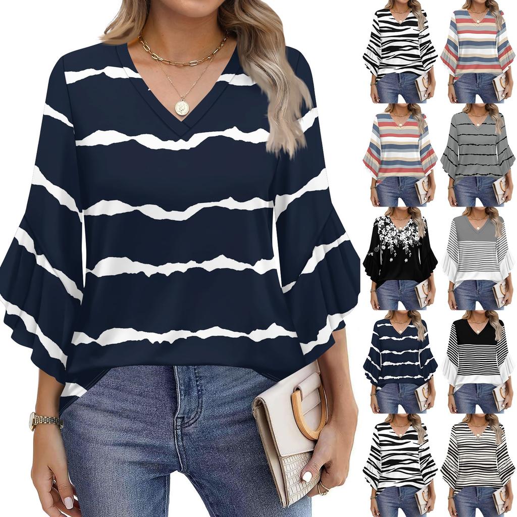 Blouses For Women Dressy Casual 3/4 Length Sleeve Womens Tops V Neck Tshirts Shirts With Flared Sleeve