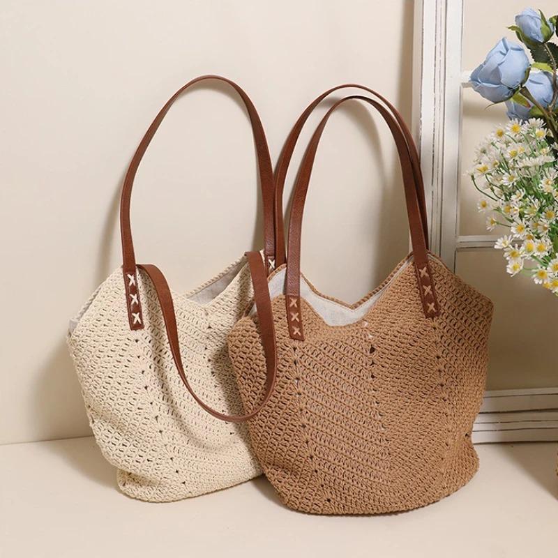 Single Shoulder Cott Thread Woven Bag, Summer Beach Vacati Hand-held Woven Bag, High-quality Grass Woven Tote Bag
