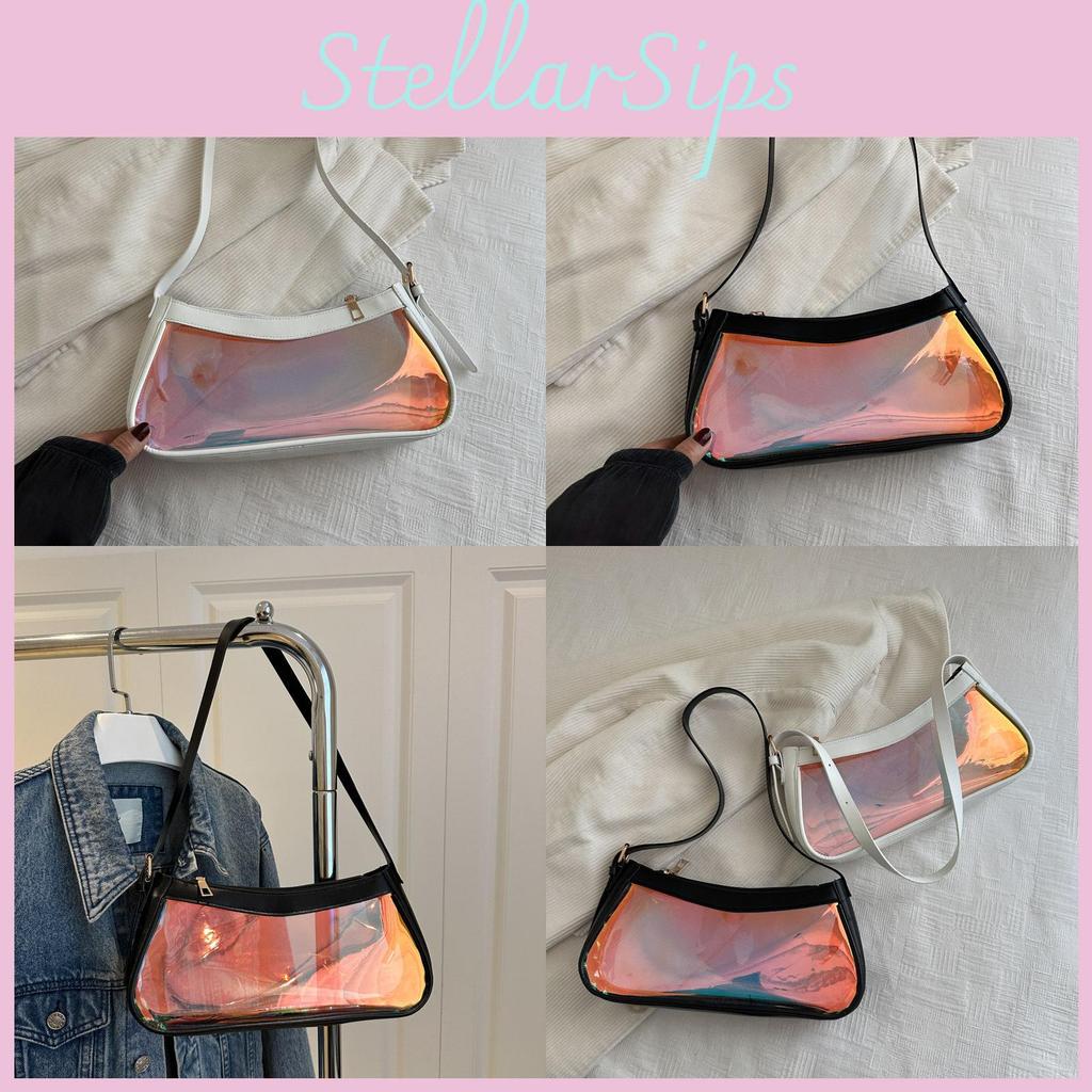 This stylish small shoulder bag features a transparent PVC construction with a laser element, enhancing its modern streetwear appeal. Measuring approximately 28.5cm in width and 13.5cm in height, it offers a compact yet functional design suitable for daily use. The bag employs a secure zipper closure and includes an interior polyester lining with an inner slip pocket for organization, providing reliable storage for essentials.