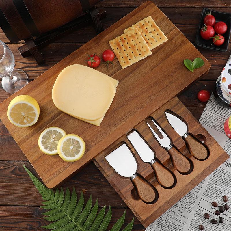 Square Acacia Wood Cheese Board & 4-Piece Stainless Steel Cheese Knife Set