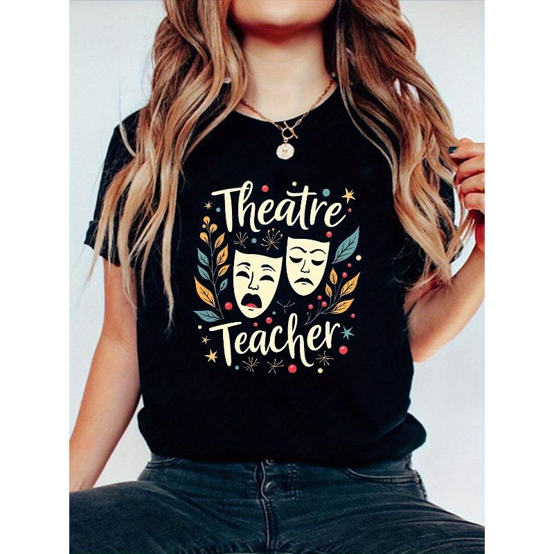 Theatre Teacher Graphic Print T-shirt, Short Sleeve Crew Neck Casual Top for Summer & Spring, Women's Clothing