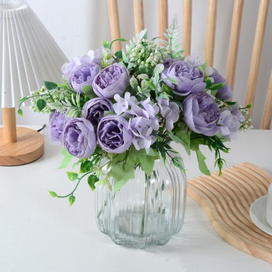 The round, full petals layered like ingots symbolize wealth and good luck, complemented by hydrangea and eucalyptus accents to evoke a charming European vintage style. Requiring no watering or maintenance, these flowers solve the common issues of fresh blooms by staying pristine without wilting or shedding. Flexible stems allow easy arrangement in bottles or vases, perfect for single elegant displays or combined bouquets to suit various décor needs.