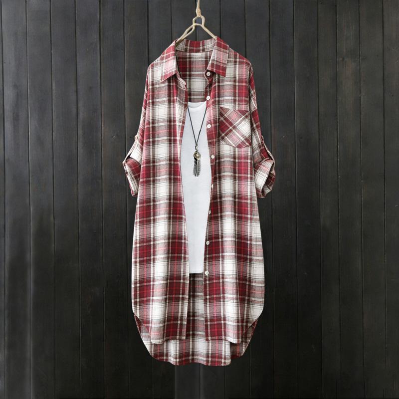 Plus Size Lightweight Retro Women Button Front Shirts for Spring/Summer Mid Length Plaid Blouse Long Sleeve Tops Blusa Feminina