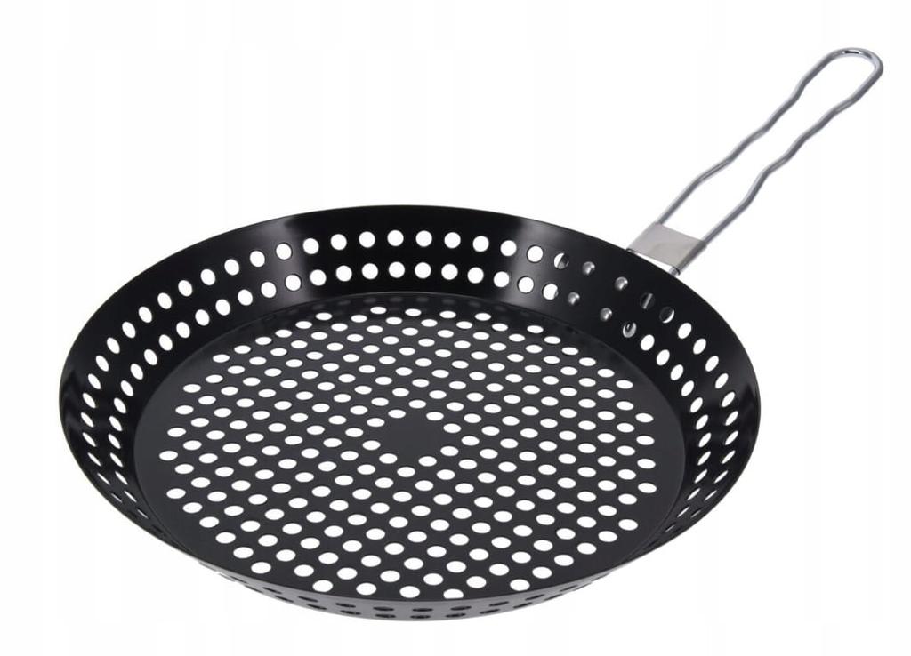 ✅ Grill Pan for grilling, in the oven, or directly over heat. The pan has a diameter of 31 cm, and the bottom diameter is 24 cm. Made of high-quality black metal, the grill pan has a non-stick coating, making frying easy and enjoyable. Especially recommended for vegetables, meat, fish, and sausages. It also has a foldable handle, which means it takes up significantly less space.