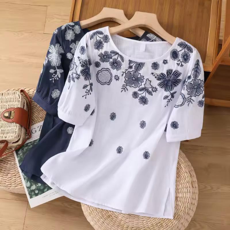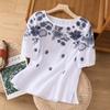 Women's Retro Embroidered Short Sleeved Loose and Thin Breathable T-shirt, Summer Artistic Slimming Casual Top