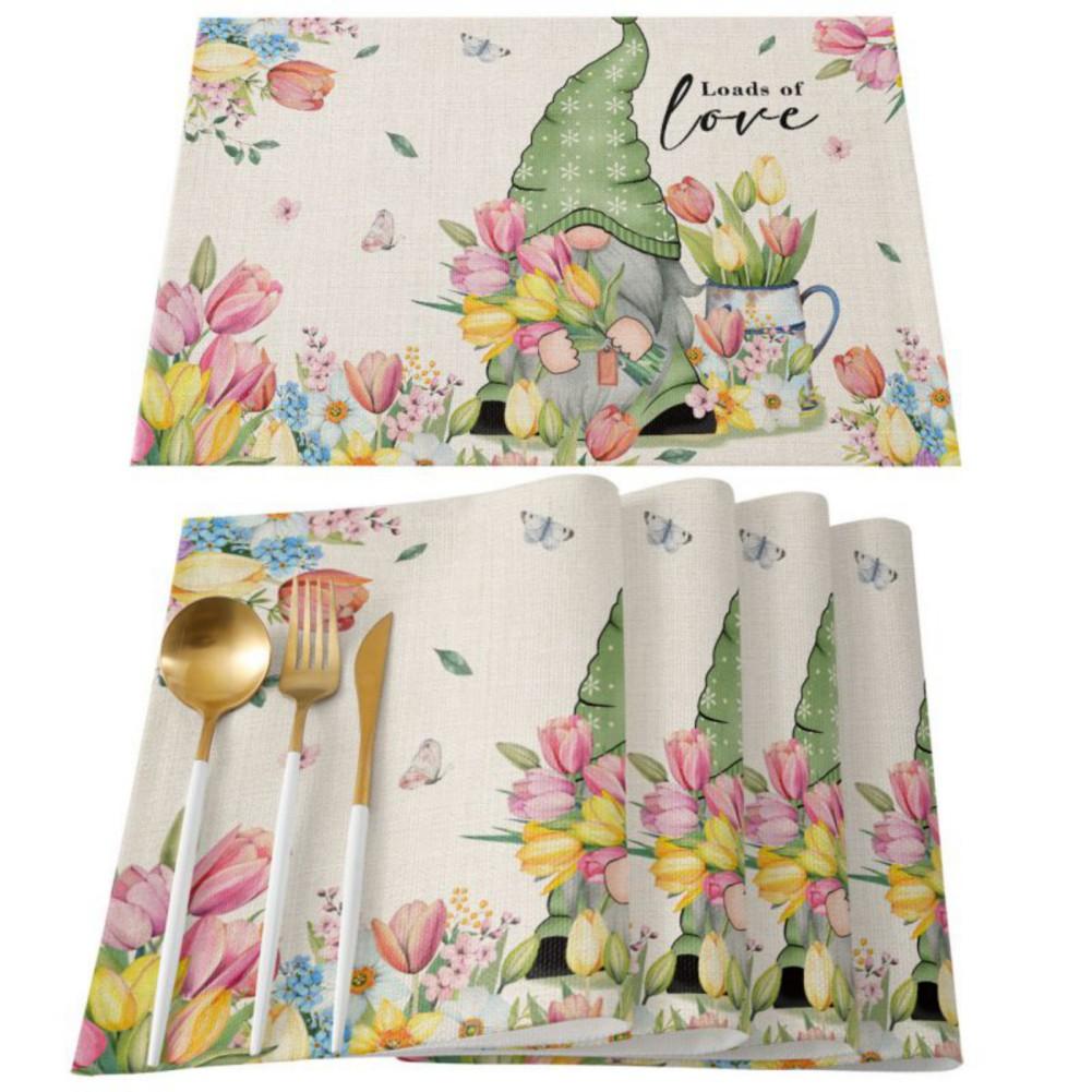 4pcs Easter Placemats Cotton Linen Heat Resistant Table Mats Non-Slip Easter Bunny Gnome Placemat Decoration for Home Kitchen