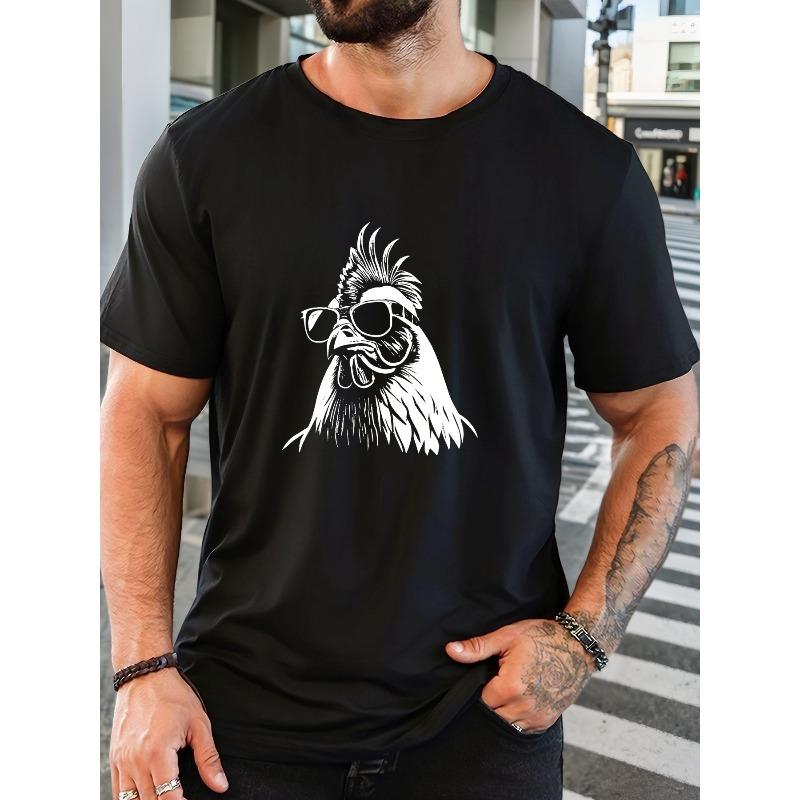 European sizes Men's Summer Casual Round Neck Short Sleeve T-Shirt with Rooster in Fashion Glasses Design