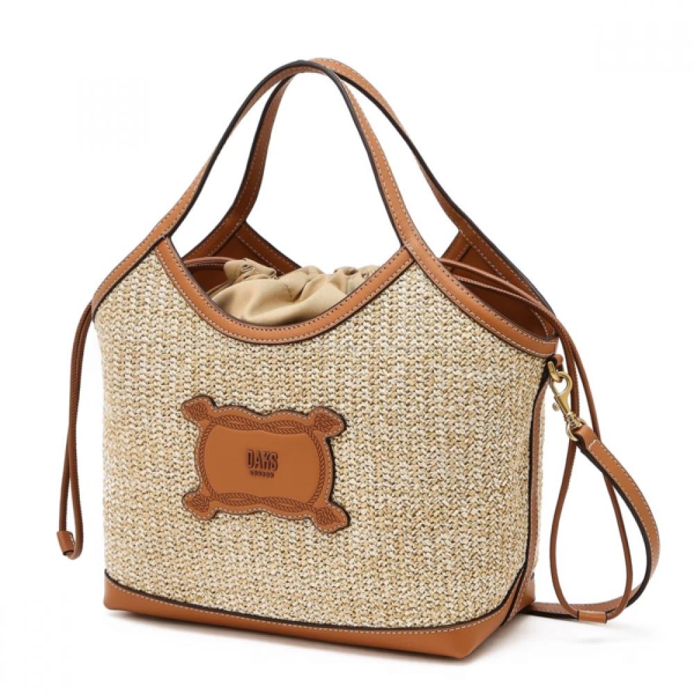 The DCBA6E140I2 [SUMMER RAFFIA] Leather Color Block Beige Raffia Tote M features a beautiful design with a logo patch detail based on woven threads, creating an elegant tote bag. Made with lightweight materials, it offers ample storage space, making it a practical item. A dust bag is included for easy storage of the bag. It has two internal pockets for efficient organization of items.