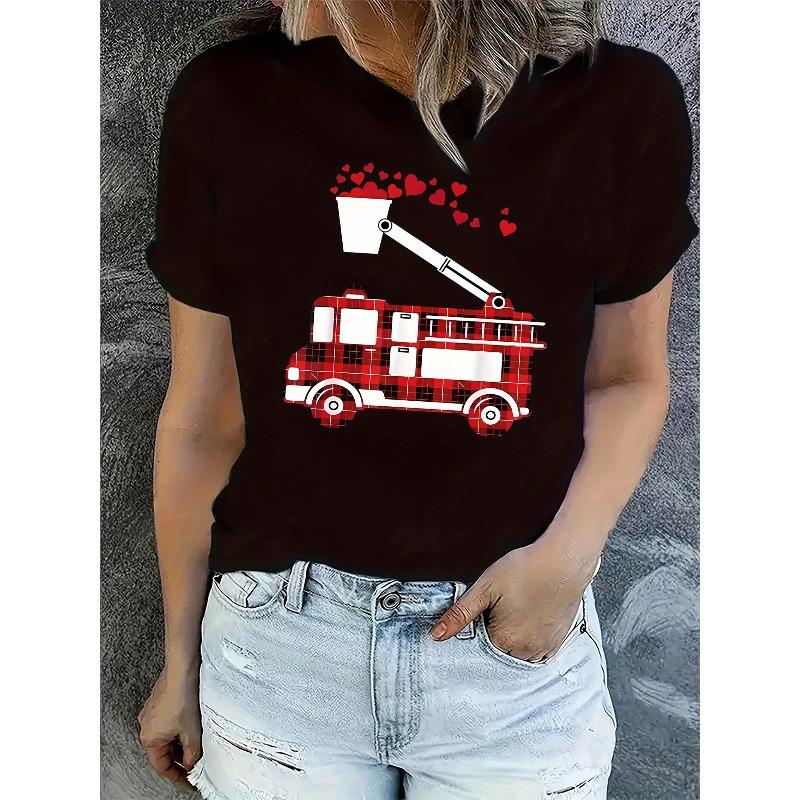Women's Heart Fire Truck Print Short Sleeve T-Shirt Crew Neck Casual Summer Holiday Top