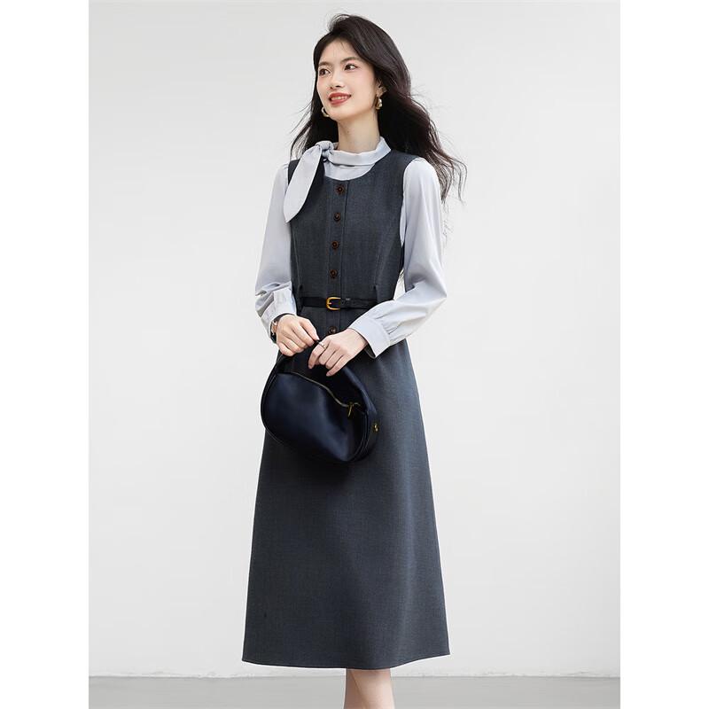 Elegant Bow-Neck Shirt & Suspenders Skirt Set