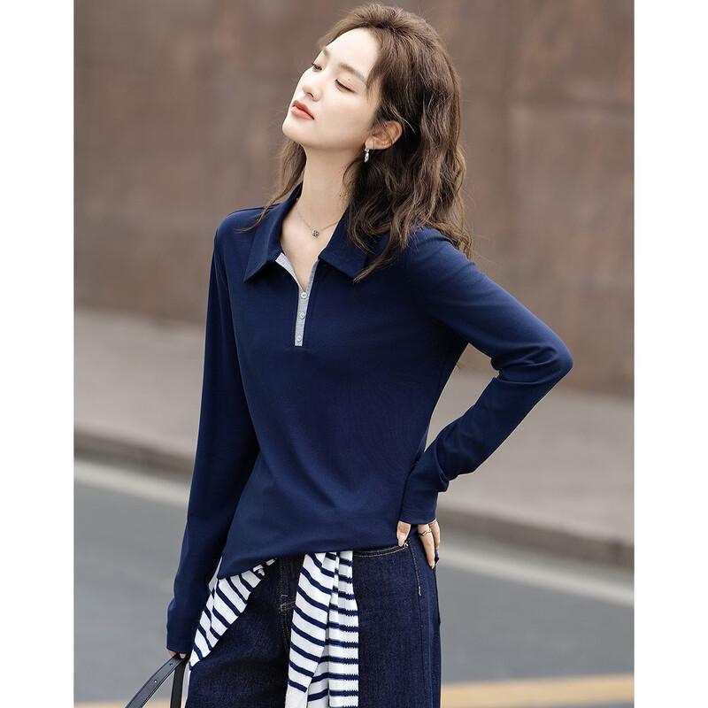 Elegant Lapel Long Sleeve T-Shirt with Contrast Buttons