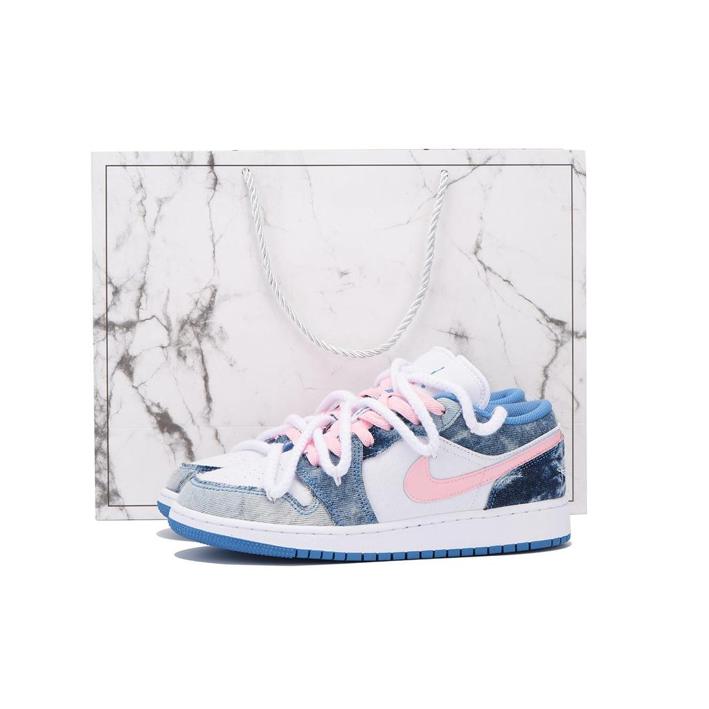 Jordan Air Jordan 1 Washed Denim Slip Resistant Abrasion Resistant Low top Vintage Basketball Shoes GS White Blue DM8947-100(Team265-SBOX)