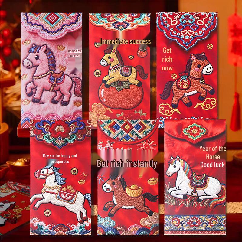 Hand-drawn Year of the Horse Red Envelope: Cute Flat Embroidery Lucky Money Bag for the Spring Festival