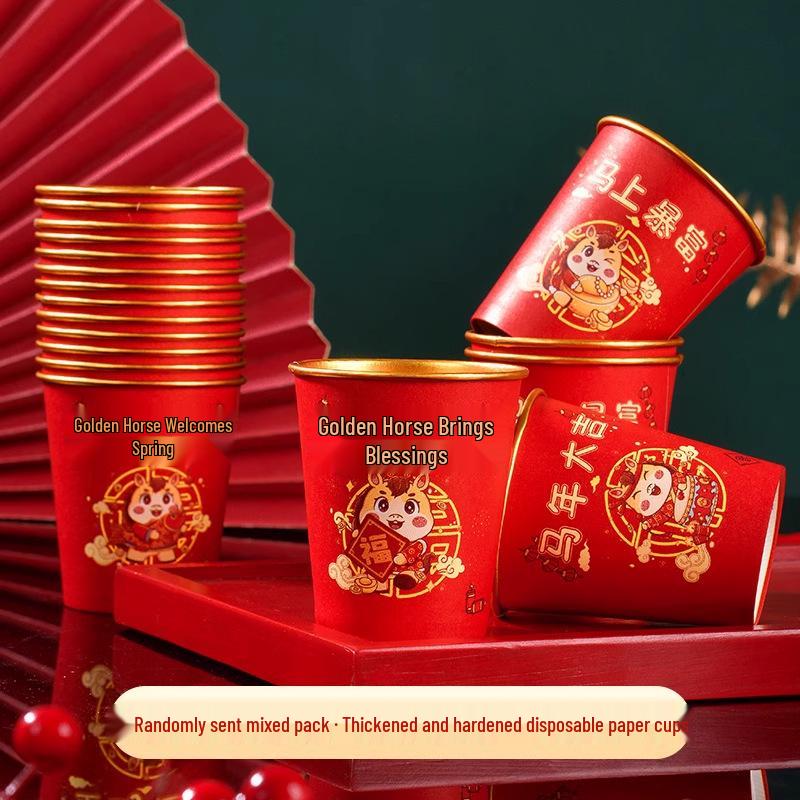 2026 Year of the Horse Red & Gold Foil Disposable New Year Cups - Thick, Anti-Scald, High-Temp Resistant Paper Cups for Spring Festival.