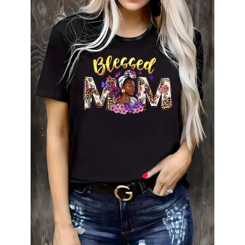 Women'S Plus Size "Blessed Mom" Graphic T-Shirt - Black Casual Tee with Floral & Geometric Design, Round Neck, Short Sleeves