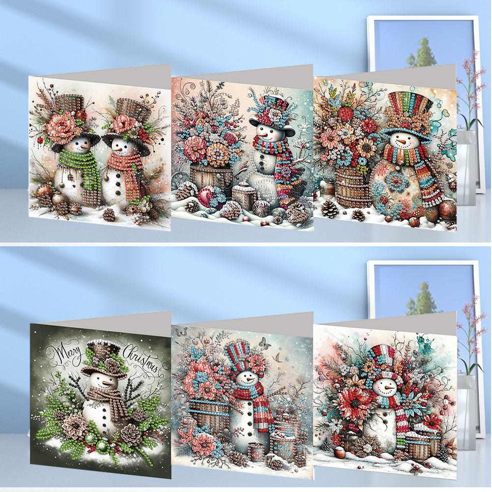 6PCS DIY Diamond Painting Christmas Snowman Cottage Mosaic Postcard Xmas Theme Rhinestone Painting Flower Pattern Greeting Cards