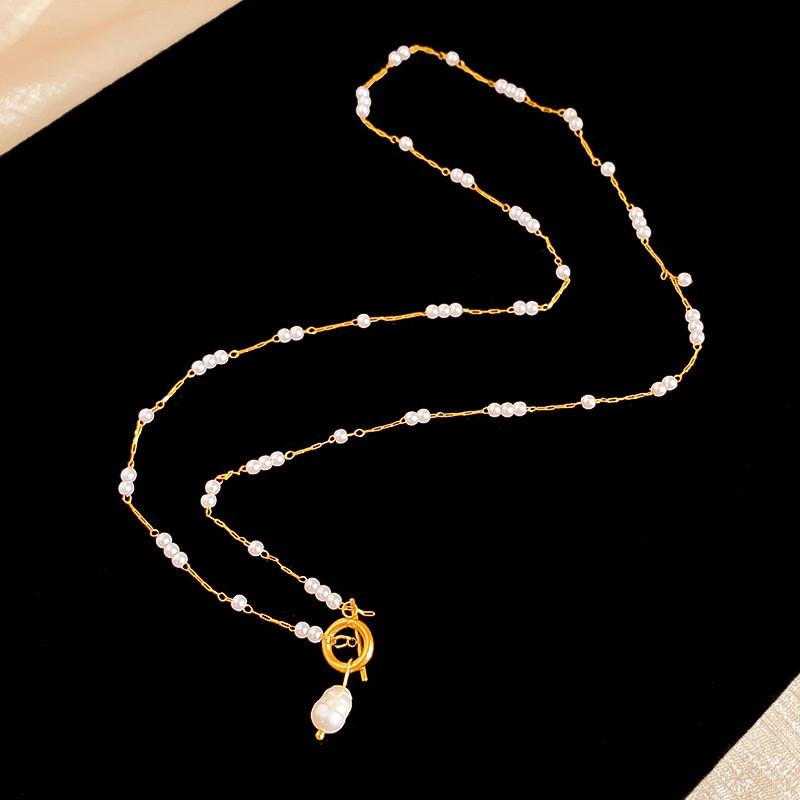 This fashion-forward French vintage-style collar necklace features a geometric design with a 51-60cm length, crafted from durable titanium steel with a sleek gold finish. The necklace showcases imitation pearls with a refined inlay process, adding a touch of elegance. Ideal for enhancing formal or casual ensembles, its perfect for summer events. Wipe clean with a soft cloth to maintain its shine.