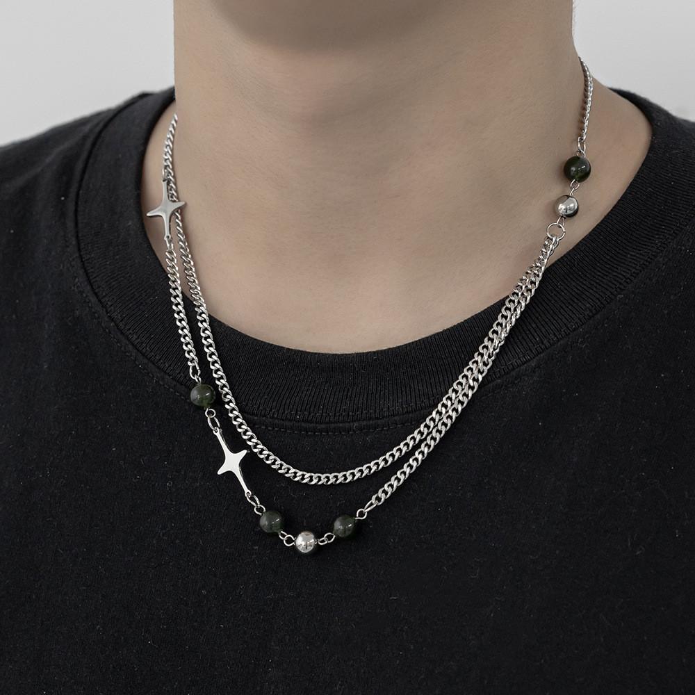 This dual-layer titanium steel necklace features a geometric cross and star design, delivering a modern, cool aesthetic. Made of durable titanium steel, it measures 16.1 to 19.7 inches in length. Ideal for casual or streetwear styles, it enhances everyday looks. Wipe with a soft cloth to maintain its shine.