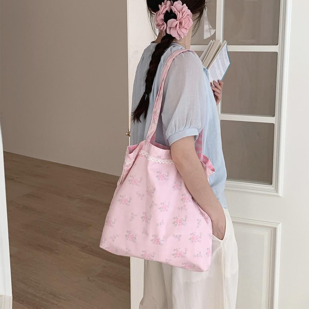 Sweet Plaid Floral Double Sided Women's Shoulder Bag Large Capacity Female Shopping Bags Casual Flower Ladies Tote Handbags
