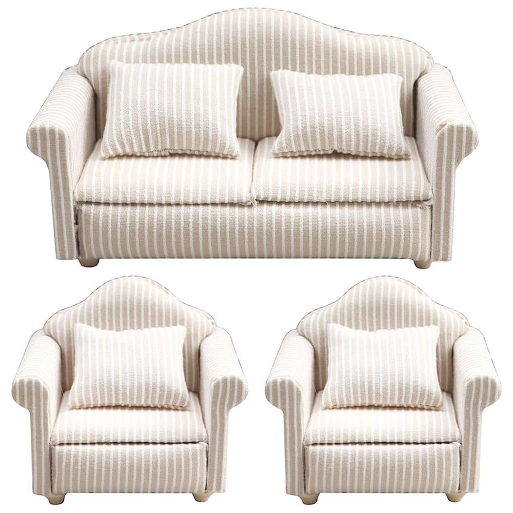 Moin Moin Miniature Furniture 1/12 Scale Sofa Set 3 Pieces White Beige Striped Fabric Dollhouse Accessories