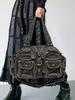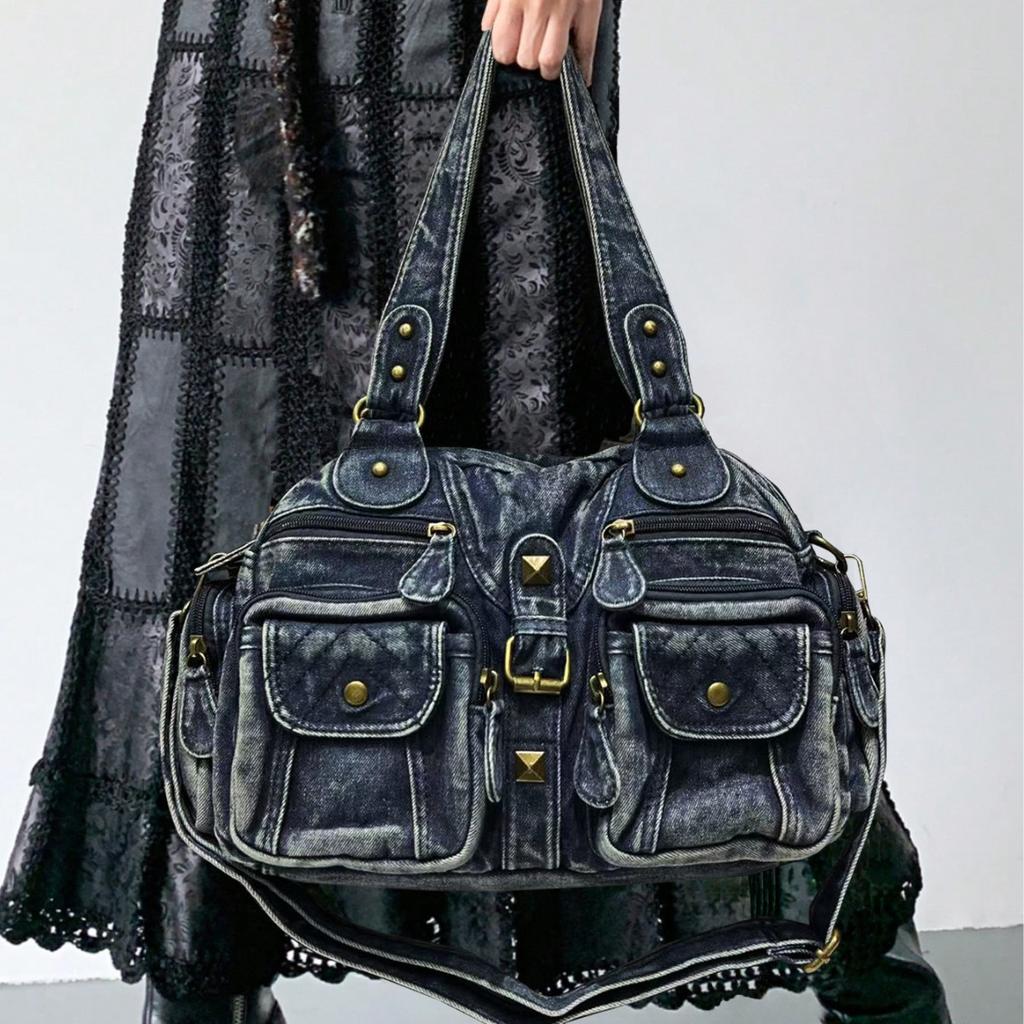 Women'S Washed Denim Tote Bag Multi-Pocket Retro Oblique Span Bag