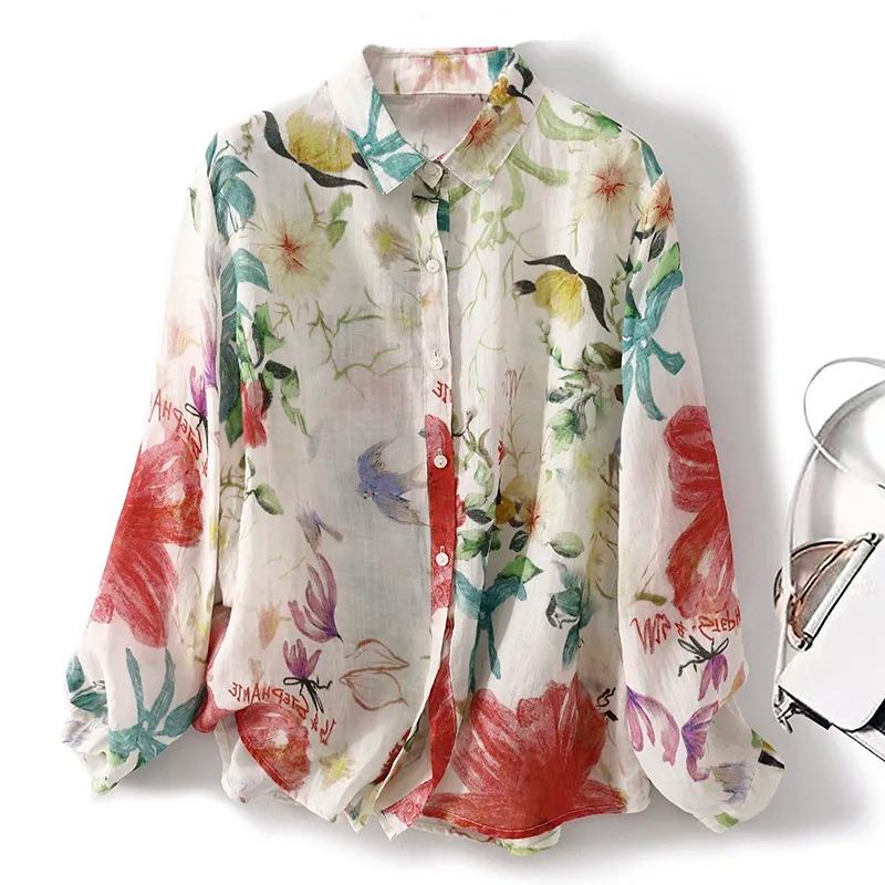 Women's Boho Floral Bird Print Turn Down Collar Long Sleeve Shirt