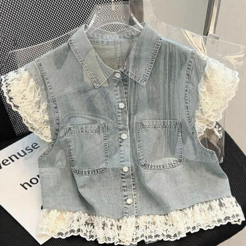Women's Vintage Light Blue Denim Lace Trim Button Down Top