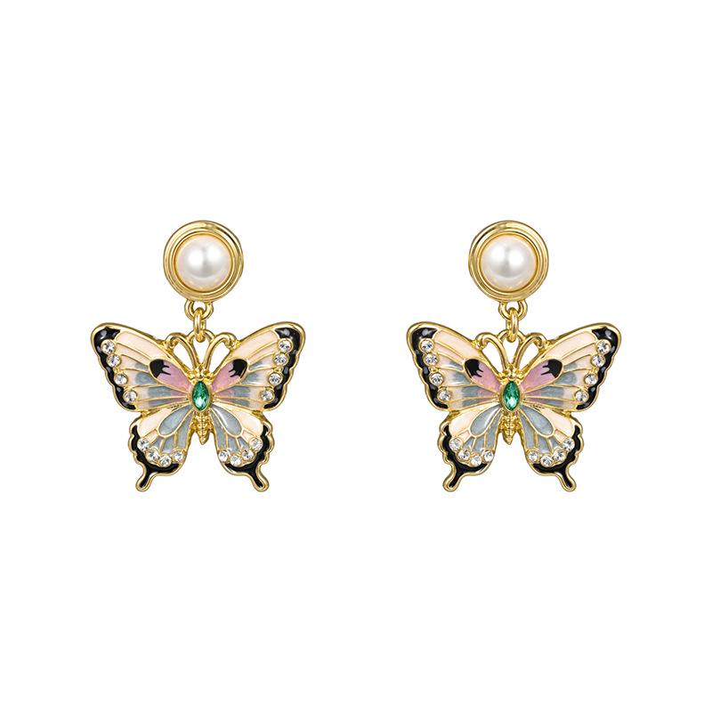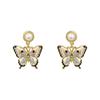 Three-Dimensional Enamel Pearl Flower & Butterfly Earrings, Court Style, Insect Series, 925 Silver Studs for Women