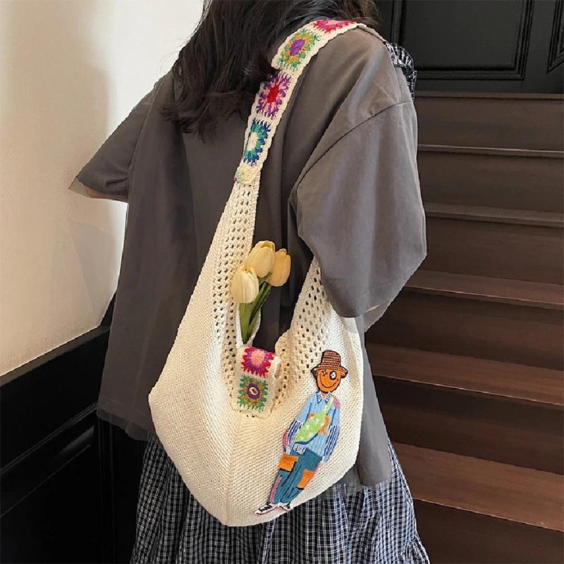 Carto Figure Hollow Mesh Knit Shoulder Bag,Beach Vacati Slouchy Chic Tote Bag,Lightweight Laid-Back Casual Women Handbag