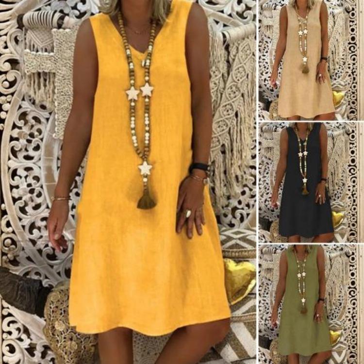 This high-quality cotton dress features a casual loose cut, ensuring comfort and style. The soft and lightweight fabric makes it a go-to piece for any occasion. Ideal for summer, the sleeveless design offers a breezy feel. This solid color dress exudes elegance and fashion, perfect for daily wear or special events.