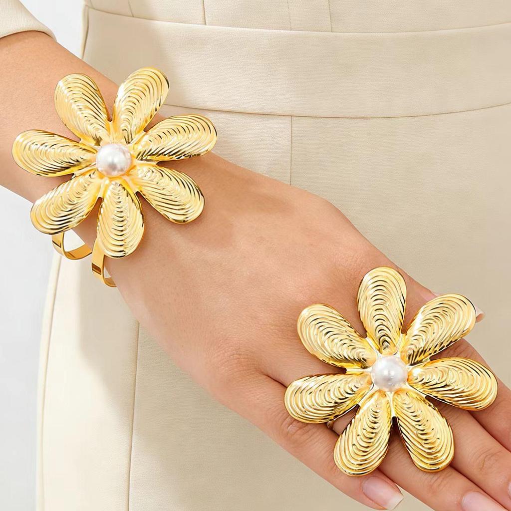 Elegant Gold Seven-Petal Flower Bracelet and Ring Set - Luxurious Retro Fashion