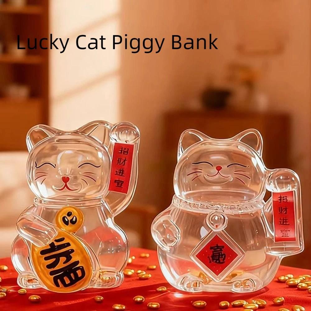 Cute Lucky Cat Piggy Bank Clear Glass Gold Bean Container Cat Shape Saving Jar Office Decor