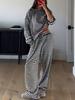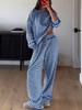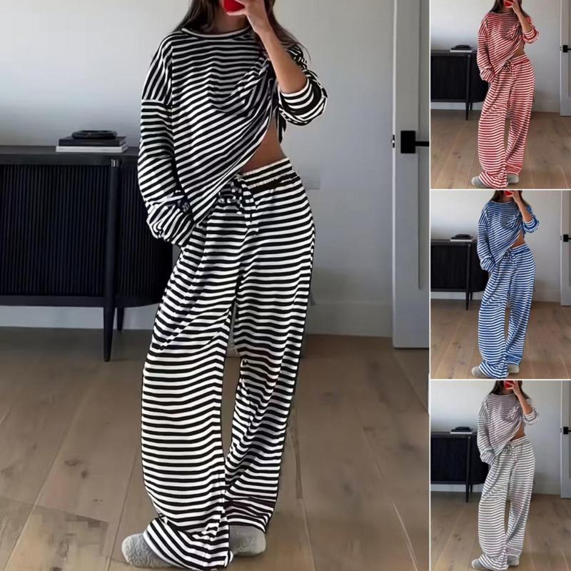Dámský jednobarevný jednoduchý pruhovaný pyžamový komplet, kalhoty s nastavitelnou šňůrkou a top s kulatým límcem v kontrastní barvě