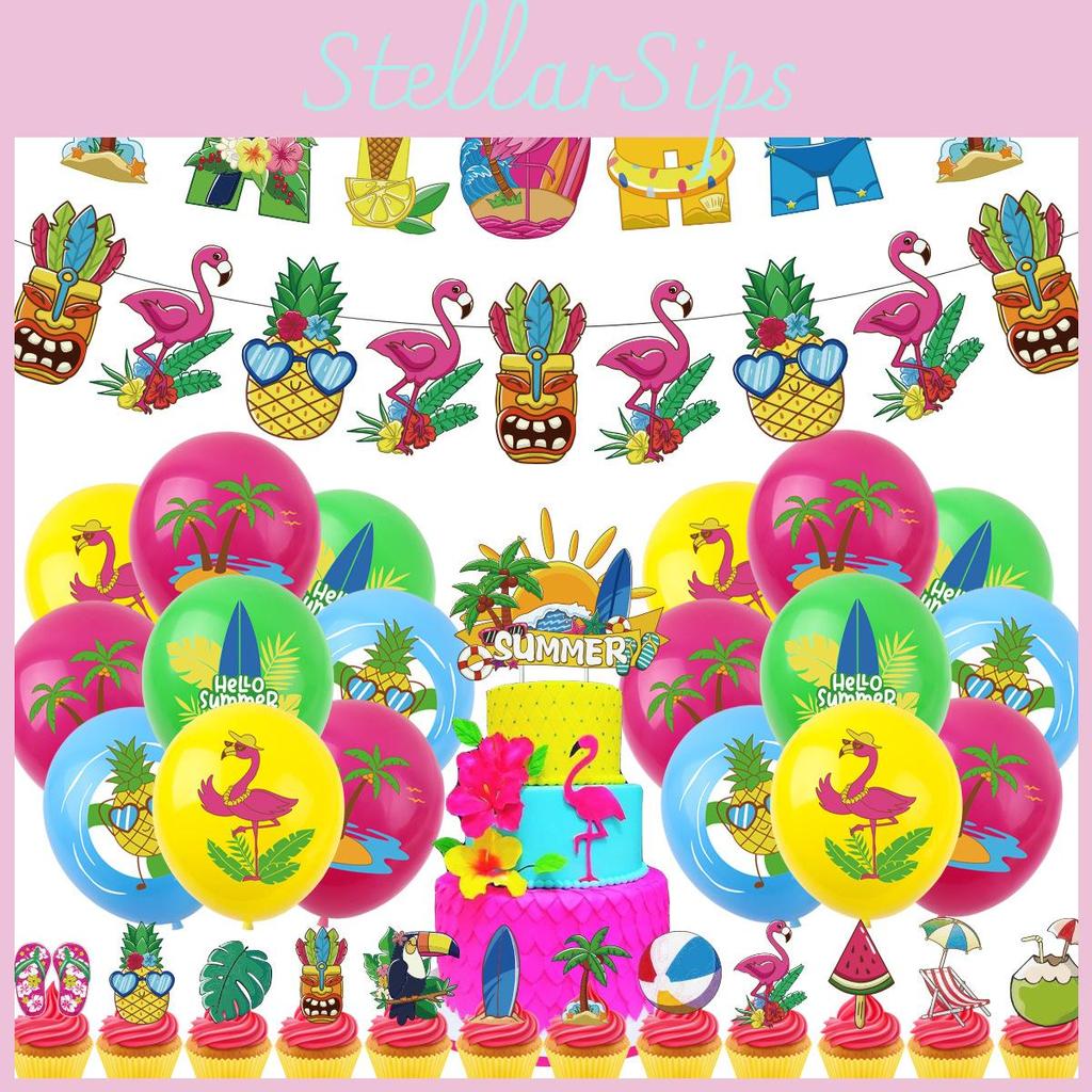 Summer Beach Party Cake Insert Balloons Hawaiian Themed Bunting Flags Set