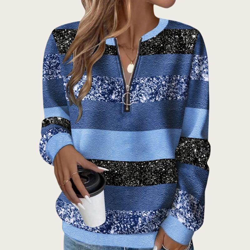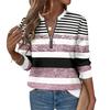 Women's color-blocked striped print shirt, half-zip, round neck, long-sleeved casual pullover top with waist belt