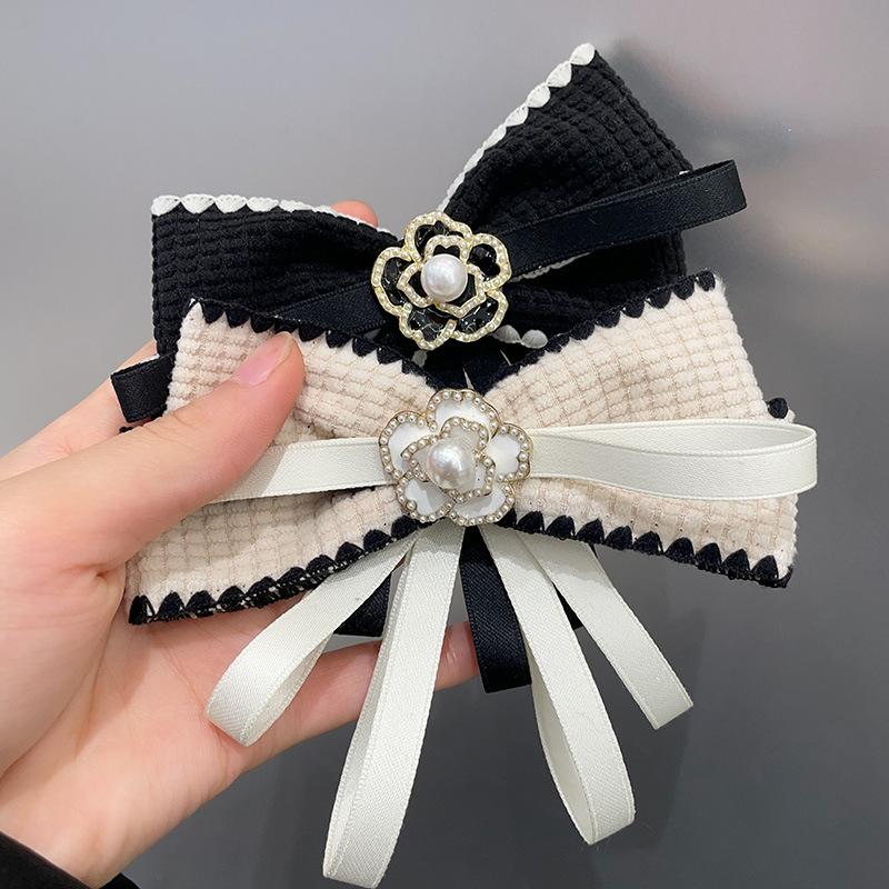 Brož Corsage s mašlí a kamélií z imitace perel Černá Jednoduchá smuteční brož Doplňky na výstřih Špendlíky na límec košile