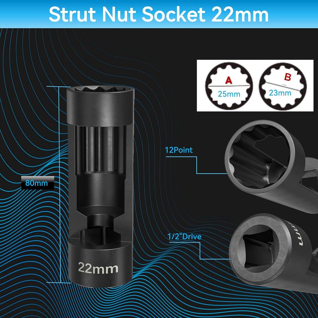 Suspension Socket Tool - 18mm, 19mm, 21mm, 22mm, 24mm Strut Nut Socket with 12 Point 1/2" Drive - Easy Remove Strut Nuts - Vm Number 3353