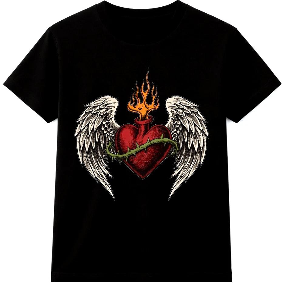 Flaming Heart T Shirt Angel Wings Tattoo Style Biker Gothic Graphic Tee