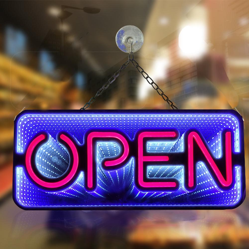3D Mirror Neon Open Sign 48x20cm Double-Sided LED Light for Pizza Coffee Bar Store - Colorful Background Infinite Tunnel Light