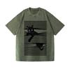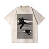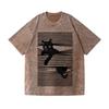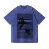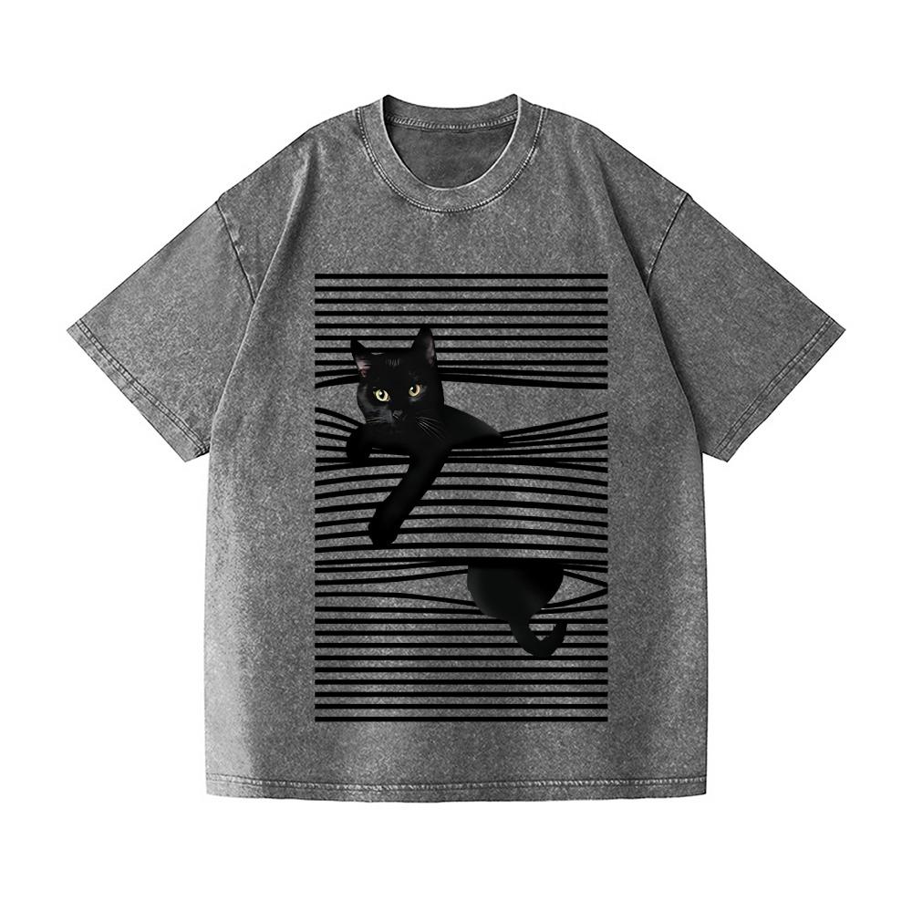 Fashion Black Cat Line Art Vintage Wash T-Shirt Japanese Style Holiday Unisex Funny Dropped Shoulder Sports Tees Casual